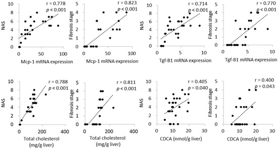 To determine the impact of dietary CA on the features of NASH, the hepatic expression profiles of genes responsible for inflammatory response, fibrogenesis, and lipid and bile acid metabolism were analyzed (Figure 3). The mRNA levels of monocyte chemotactic protein-1 (Mcp-1) were increased in a dose-dependent manner relative to CA intake. The expression levels of procollagen type I, alpha 1, and the profibrotic marker transforming growth factor (Tgf)-β1 were increased in a dose-dependent manner in the CA groups, consistent with the observed histological fibrotic changes in the liver. Indeed, the mRNA expression of Mcp-1 and Tgf-β1 were positively and strongly correlated with NAS and fibrosis stage (Figure 4).