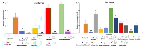 Expression profile of EsigGOBP1 in E. signifer larvae from exposure to key volatiles. (A) 3rd instar larvae; (B) 5th instar larvae. The standard errors are represented by the error bars, * and ** above the bars denote significant differences at p < 0.05 and p < 0.001 respectively.