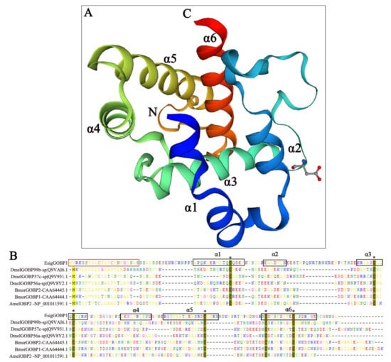 Sequence and structure of EsigGOBP1. (A) Three-dimensional structure of EsigGOBP1; (B) Alignment of EsigGOBP1 with 3D structures of GOBPs in insect and AmelOBP2. The six a-helices with black boxes are as follows, Ala18–Glu23(α1a), Ile26-Ile33 (α1b), Glu40–Lys46 (α2), Lys69–Lys82 (α3), Leu94–Asp103 (α4), Arg108–Asn125 (α5), and Asn140–Glu157 (α6); the red boxes refer to signal peptide; the * refer to six conserved cysteines. The structure was predicted using the SWISS MODEL online tools (http://swissmodel.expasy.org/, accessed on 27 May 2022) and based on Helicoverpa armigera pheromone-binding protein PBP1 at pH 7.5 (PDB ID: 7vw8.1.A).