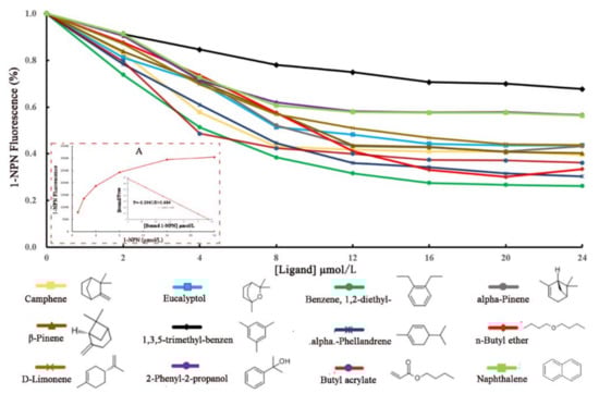 In previous studies, results from behavior choice assays to the exposure of eucalyptus volatiles, showed that the 3rd and 5th instar larvae of E. signifer, were significantly attracted to only o-cymene and β-Pinene, respectively [,]. To determine whether EsigGOBP1 commonly perceive these GC-EAD active volatiles, we evaluated the binding affinities of recombinant protein EsigGOBP1 to these volatiles using the fluorescence competition binding assays (FCBA). In accordance with the binding curve and Scatchard plots, EsigGOBP1 exhibited high affinity toward reporter 1-NPN with a dissociation constant K1-NPN of 3.375 µM (A in Figure 3). The competitive fluorescence binding curves showed that all evaluated ligands reduced the relative fluorescence intensity of the [EhipGOBP1/1-NPN] mixture (Figure 3). In detail, the calculated Kd values ranged from 0.79 µM to 4.60 µM. At the lower level were 0.79 µM for benzene, 1,2-diethyl-, 0.89 µM for alpha-phellandrene, 0.90 µM for butyl acrylate and 0.99 µM for camphene; at the mid-level were 1.18 µM for n-butyl ether, 1.24 µM for alpha-pinene, 1.27 µM for eucalyptol, 1.32 µM for β-pinene and 1.43 µM for d-limonene; at the higher levels were binding to naphthalene, 2-phenyl-2-propanol and 1,3,5-trimethyl-benzendo which recorded Kd were 2.69, 2.77 and 4.60 respectively; however, their concentrations were lower than 50% of the tested concentrations (Figure 3 and Table 1). Thereby the results indicated that EsigGOBP1 was a functional protein allowing E. signifer larvae to recognize eucalyptus VOCs, and showed the strongest affinity for benzene, 1,2-diethyl-, alpha-phellandrene, butyl acrylate and camphene.