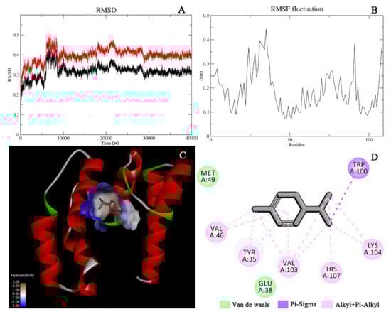 Molecular docking index of the EsigGOBP1–alpha-phellandrene complex. The root-mean-square deviation (RMSD) values for carbon backbones of the EsigGOBP1–alpha-phellandrene complex during the 40 ns molecular dynamics (MD) simulations (A); Residue fluctuations for the EsigGOBP1–alpha-phellandrene complex during the 40 ns MD simulations (B); Canonical conformations of the EsigGOBP1-alpha-phellandrene complex. (C) Interactions in the EsigGOBP1-alpha-phellandrene complex (D).