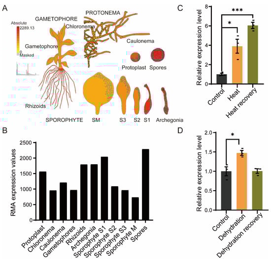 Gene expression patterns of PpRNH1A throughout the life cycle of P. patens and the expression levels under different stresses. (A) Visualization of the expression of PpRNH1A at different tissues during P. patens growth and development. (B) The RMA expression values of PpRNH1A at different periods of growth and development. Data were downloaded from Physcomitrella eFP Browser. (C) Gene expression levels of PpRNH1A under heat stress and after heat recovery. (D) Gene expression levels of PpRNH1A under dehydrating stress and after recovery. For (C,D), data are presented as means ± SEM of three replicates; t-test was used for statistics; asterisks indicate the significant difference between treatment group and the control group, * p < 0.05, *** p < 0.001.