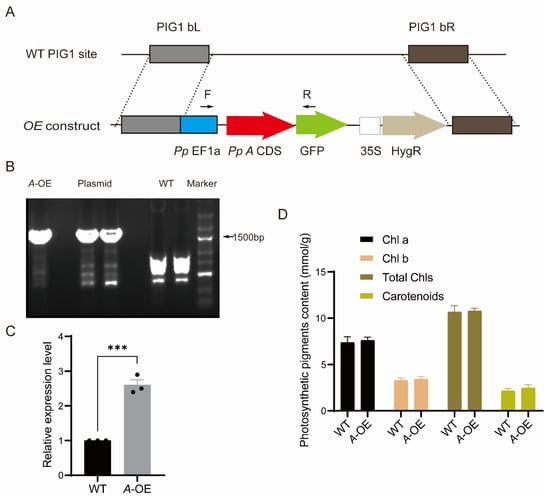 Stable PpRNH1A-overexpression lines in P. patens. (A) Schematic diagram of pPOG1-A construct. P, plasmid; PIG1 bL, left targeting site; PIG1 bR, right targeting site; PpEF1a, the EF1a promoter from P. patens; HygR, hygromycin selectable marker cassette; GFP, green fluorescent protein. (B) Positive PpRNH1A-overexpression (A-OE) plants were confirmed at DNA level. WT, wild type; A-OE, PpRNH1A-overexpressing plant. (C) Identification of A-OE plant by qRT-PCR at RNA level. (D) Pigment contents in WT and A-OE under normal growth conditions. Chl a: chlorophyll a; Chl b: chlorophyll b; Total Chls: Total chlorophylls. For (C,D), data are presented as means ± SEM of three replicates; t-test was used for statistics; asterisks indicate the significant difference between WT and A-OE, *** p < 0.001.