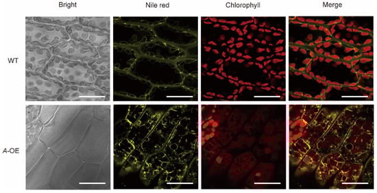 Accumulation of lipid droplets in WT and A-OE under normal growth conditions. Scale bar = 20 μm.