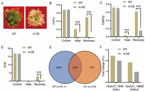 Response of A-OE plants to heat stress (HS) treatment. (A) A-OE plants were more sensitive to heat stress. (B–D) Chlorophyll fluorescence (Fv/Fm) (B), non-photochemical energy dissipation (NPQ) (C), and electron transport rate (ETR) (D) of WT and A-OE before HS, after HS, and after recovery from the heat stress. Data are presented as means ± SEM of three replicates; t-test was used for statistics; asterisks indicate the significant difference between WT and A-OE, *** p < 0.001. (E) Venn diagram shows the overlapping between HS-regulated DEGs in WT (WT versus WT under heat stress) and PpRNH1A-regulated DEGs (WT versus A-OE under normal growth conditions). (F) Fold change comparison of the expression levels of DNAJ and DNAJC under HS and normal conditions. Each bar represents the ratio of the average expression value of three biological replicates of HS (after heat stress) vs. control (before heat stress).