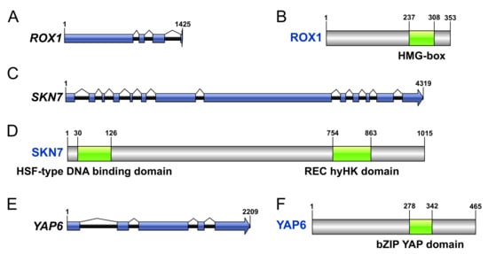 Bioinformatic characterization of ROX1, SKN7, and YAP6 in X. dendrorhous. Graphical representations of genes ROX1 (A), SKN7 (C), and YAP6 (E) identified in X. dendrorhous are shown, where blue linked boxes indicate its coding region as exons. The gene products ROX1 (B), SKN7 (D), and YAP6 (F) are represented with gray boxes, corresponding to their translated sequences, where green regions show significant conserved domains (E-value < 0.01). Each conserved domain and its coordinates are indicated.