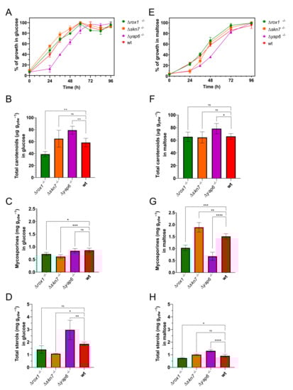 Phenotypic characterization of Δrox1−/−, Δskn7−/−, and Δyap6−/− mutant strains in X. dendrorhous. Growth profile of wild-type and mutant strains in minimal medium YNB glucose 2% (glucose condition, (A)) and in minimal medium YNB maltose 2% (maltose condition, (E)). It is shown as the percent of maximal growth observed in each strain. Bar plots represent the carotenoid production in glucose (B) and maltose (F), the mycosporine production in glucose (C) and maltose (G), and the total sterol content in glucose (D) and maltose (H) for each strain used in this work. One-way ANOVA followed by Fisher’s LSD test was used for statistical comparison between the wild-type and each mutant strain. Statistical significance is represented with asterisks over each line (* p ≤ 0.05, ** p ≤ 0.01, *** p ≤ 0.001, and **** p ≤ 0.0001, ns = not significant).