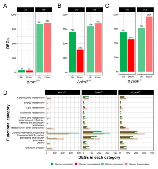Functional classification of DEGs was carried out based on the KEGG Orthology (KO) database, as previously described []. The most represented functional categories between DEGs were “Genetic information processing” and “Environmental information processing and cellular processes” for all mutants in both conditions (Figure 3D). Interestingly, DEGs in “Genetic information processing” were mainly upregulated in all mutant strains in both conditions, except in Δyap6−/− in maltose, where DEGs in this category were mainly downregulated. Other categories, such as “Carbohydrate metabolism” and “Metabolism of other compounds,” were also highly represented ubiquitously between all strains and conditions. “Amino acid metabolism” was mainly upregulated in all mutant strains in both carbon sources. In addition, “Lipid metabolism” was found to be mainly downregulated in the Δrox1−/− and Δyap6−/− strains under maltose conditions, and in the Δskn7−/− strain under both carbon sources. Notably, several DEGs were classified on “Unknown function” category because it was unable to assign a k-number to them.