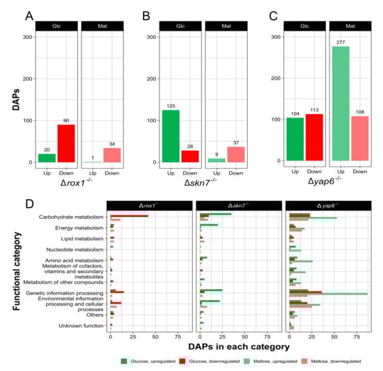 In the case of the Δyap6−/− strain, 104 and 113 DAPs were upregulated and downregulated under glucose conditions, respectively. For maltose, 277 DAPs were upregulated, while 108 were downregulated (Figure 4C). It is remarkable that the total DAPs upregulated in maltose were at least double the DAPs upregulated in glucose.