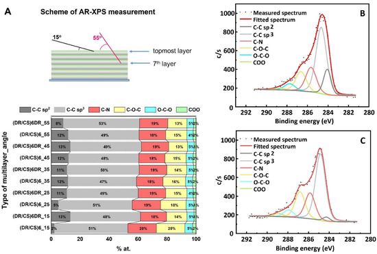 (A) Graphical representation of the angle-resolved XPS measurements. The outermost and deeper layers were analyzed at angles of 15 and 55 degrees, respectively. Data were collected using a series of sample tilt angles: 15, 25, 35, 45, and 55 degrees. Contribution of varying carbon chemical states for (DR/CS)6 and (DR/CS)6DR. XPS-fitted C1s line for photocrosslinked (DR/CS)6 (B) and photocrosslinked (DR/CS)6DR (C). The spectra shown were collected at a 15-degree angle.