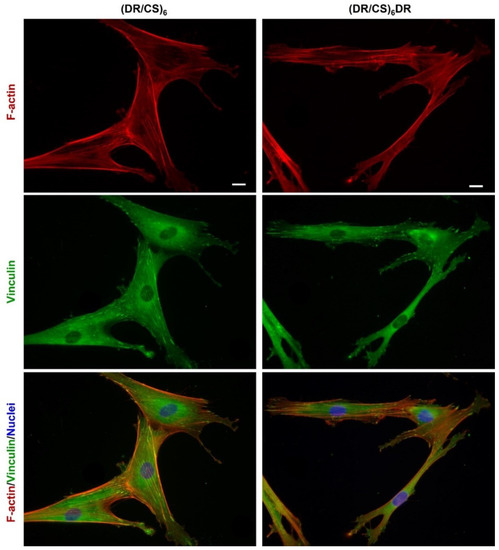 Changes in the actin cytoskeleton architecture in hUC-MSC grown on both types of DR/CS multilayer films. Cells were cultured in a medium supplemented with 2% FBS for 24 h and were then immunostained for vinculin and counterstained with TRITC-phalloidin (F-actin) and DAPI (nuclei). The scale bar represents 25 μm.
