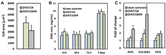 (A) Cell area 24 h after seeding. (B) DNA concentration of hUC-MSC proliferation evaluated after 24, 48, 72 h, and 7 days of cell-culture on a clean substrate, (DR/CS)6 and (DR/CS)6DR. (C) Expression of osteogenic markers in hUC-MSCs cultured on a clean substrate, (DR/CS)6, and (DR/CS)6DR for 7 days in vitro. Quantitative real-time PCR analysis of selected osteogenic markers (ALPL–alkaline phosphatase; COL10A1–collagen type 10; OCN–osteocalcin) in hUC-MSCs cultured in DMEM/F12, 2% FBS). Gene expression was normalized to the expression of a housekeeping gene–GADPH, shown as the fold-change compared to gene expression in hUC-MSCs cultured on the clean substrate. p values less than 0.05 (p < 0.05) were considered statistically significant in comparison to the control and are labeled with an asterisk (*).
