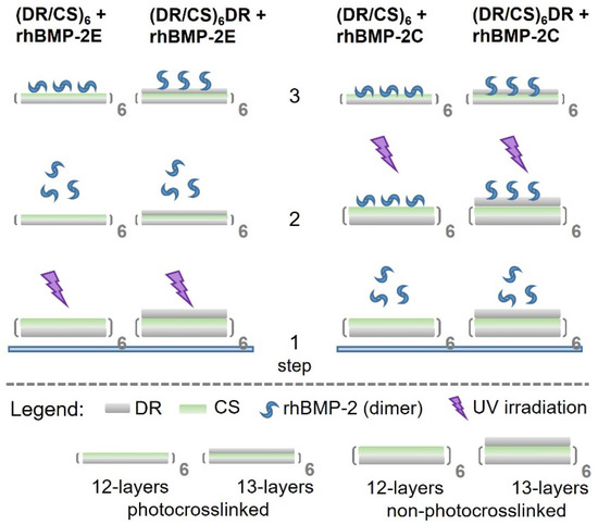 The rhBMP-2 was deposited onto polymeric surfaces with the topmost layer composed either of DR or CS. The protein was deposited both before and after the photocrosslinking of multilayers (Figure 4—step 1, left side and step 2, right side), so the protein was bound to the surface covalently (C) and electrostatically (E), respectively. Thus, four systems were obtained and studied: (DR/CS)6 + rhBMP-2C, (DR/CS)6DR + rhBMP-2C, (DR/CS)6 + rhBMP-2E, and (DR/CS)6DR + rhBMP-2E (Figure 4). The substrates were incubated for 15 min with 1.00 μg/mL rhBMP-2 aqueous solution (pH 6.2). Incubation was carried out in air saturated with water vapor. Then, the substrates were gently washed with water.
