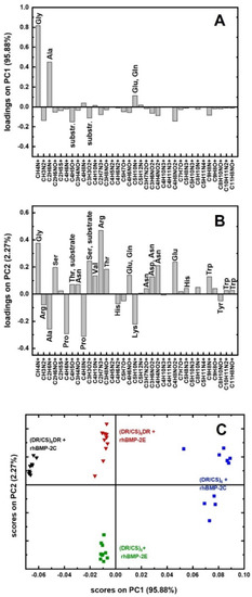 After the photocrosslinking of the multilayers, the rhBMP-2 homodimer was deposited via electrostatic interactions to obtain two systems denoted as (DR/CS)6 + rhBMP-2E and (DR/CS)6DR + rhBMP-2E (Figure 4, step 2 left side). When the rhBMP-2 homodimer was deposited via electrostatic interactions with the surface followed by photocrosslinking, two other systems were obtained, denoted as (DR/CS)6 + rhBMP-2C and (DR/CS)6DR + rhBMP-2C (Figure 4, step 2 right side). Thus, four systems were obtained based on the physical (E) and chemical (C) immobilization of rhBMP-2 on both surfaces. TOF-SIMS with multivariate principal component data analysis was used to study the differences in rhBMP-2 interactions within the topmost layers. TOF-SIMS is an attractive technique because of its sensitivity to the outermost region of the surface. The SIMS sampling depth is smaller (~1–2 nm) than the size of the molecules of most proteins, so the differences in the proteins’ state (orientation, conformation) can be examined [36]. This technique evaluated the protein surface coverage in our research and was used to analyse the protein state. The multivariate principal component data analysis allowed the investigation of the protein orientation and conformation regarding exposed amino acids [37]. The main source of the variability of the TOF-SIMS intensities in the analyzed dataset, captured by the first principal component (PC1) at 95.88% (describing most of the total variance), was related to the protein surface coverage (Figure 5A). The second principal component (PC2), capturing 2.27% of the variance, separated samples with different protein states (Figure 5B). The score plot (PC2 vs. PC1) for the developed PCA model obtained for all proteins’ bonded systems revealed the variety of the amounts of rhBMP-2 adsorbed on the studied surfaces (Figure 5C).