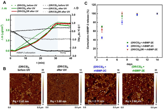 (A) rhBMP-2 adsorption/desorption QCM-D measurement using the Au/SiO2 sensor coated with (DR/CS)6 before photocrosslinking (dotted curves) and (DR/CS)6 and (DR/CS)6DR after photocrosslinking (solid curves), expressed as the mass shift (green and red curves) and dissipation shift (black and grey curves). rhBMP-2 was used as an aqueous solution of 1 μg/mL, pH 6.2, and flow rate of 0.15 mL/min, adhered for 30 min (blue area). (B) Representative topography images of (DR/CS)6 multilayers in the liquid state before and after photocrosslinking and after the deposition of rhBMP-2 from 1 μg/mL solution: covalent and electrostatic bonding. Measurements were performed in sterile water at room temperature using tapping mode. The root-mean-square roughness (Rq) values corresponding to each image are shown. (C) Release of rhBMP-2 detected by ELISA from surfaces of different types.