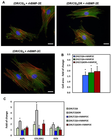 Protein immobilization is a common approach to changing the microenvironment for cells [17]. Therefore, it is essential to recognize the protein’s structural rearrangement upon immobilization, depending on the choice of immobilization method and if it affects their biological activity. The best way to analyze the protein activity is to investigate if it causes changes in the cellular response. Therefore, we studied the response of hUC-MSCs to rhBMP-2 immobilization in the abovementioned systems. As shown in Figure 7A, protein immobilization significantly affected cell flattening. hUC-MSCs cultured on surfaces with rhBMP-2 immobilized formed dense and prominent microfilament bundles (actin stress fibers, red) and vinculin-rich focal adhesion complexes (green). Cells seeded on selected surfaces with deposited rhBMP-2 had an area in the range of 1.5- to 2-times statistically significantly larger than that of appropriate control cells, i.e., cells cultured on polymeric multilayers without immobilized rhBMP-2 (Figure 7B). Recent studies have shown that this improved adhesion may result from the interplay between integrins and BMP receptors [16,50]. Mesa-Restrepo et al. [51] reported that the presence of BMP-2 on Ti discs plays an important role in cellular adhesion and spreading of C2C12 cells by increasing of filopodia number per cell and vinculin expression. It was shown that BMP-2 enhances the formation of focal adhesions and stress fibers in osteoblasts by increasing α5 and β1 integrin expression and also triggers cell migration [52]. The synergistic effect of BMP-2 on cell adhesion and mechanotransduction is possible only when rhBMP-2 is immobilized on the material surface, i.e., not dissolved in the medium [53].