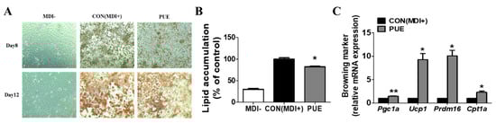 Figure 1A shows the results of Oil Red O staining after 8 and 12 days of adipocyte differentiation in 3T3-L1 cells treated with the differentiation drugs methylisobutylxanthine, dexamethasone, and insulin (MDI) and PUE (100 μg/mL). It was found that PUE reduced the accumulation of lipid droplets (Figure 1A,B). Moreover, PUE supplementation significantly increased the expression of browning markers (Pgc1a, Ucp1, Prdm16, and Cpt1a) compared to that in the CON (MDI+) group (Figure 1C).