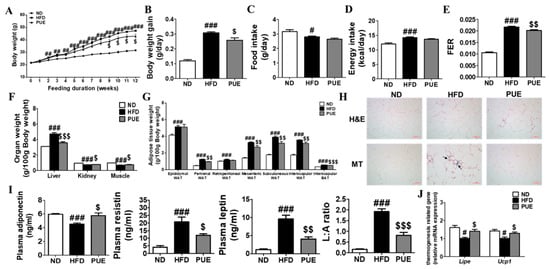The body weight of the high-fat diet (HFD) group animals was markedly higher from week 2 compared to that of the normal diet (ND) group, whereas that of the PUE group significantly decreased after week 9 compared to the HFD cohort (Figure 2A). The average daily body weight gain (BWG) for 12 weeks (g/day) in the PUE group was significantly lower than that in the HFD group (Figure 2B). There were no significant differences in food and energy intake between the HFD and PUE groups (Figure 2C,D). This led to a significantly lower food efficiency ratio (FER) in the PUE group than in the HFD group (Figure 2E). The liver weights of the HFD group were significantly higher than those of the ND animals, while those of the PUE group were significantly lower than that of the HFD group. In addition, kidney and muscle weights were significantly higher in the PUE group than in the HFD group (Figure 2F). The HFD group exhibited significantly increased adipose tissue weight and adipocyte size compared with the ND cohort. However, PUE supplementation significantly decreased the perirenal, mesenteric, subcutaneous, and interscapular WAT and BAT weights and adipocyte size. WAT collagen accumulation was assessed by Masson’s trichrome (MT) staining, and fibrosis (stained blue) clearly progressed in the HFD group, but not in the ND and PUE groups (Figure 2G,H). Plasma adiponectin levels were significantly higher in the PUE group than in the HFD group. The plasma leptin, resistin, and leptin: adiponectin (L:A) ratio values in the HFD group were significantly increased compared to those in the ND group; their values in the PUE supplementation group were markedly lower than those in the HFD group (Figure 2I). The mRNA expression of Lipe in epiWAT was markedly increased in the ND and PUE groups compared to that in the HFD group. In addition, PUE significantly upregulated the mRNA expression of thermogenic genes such as Ucp1 in epiWAT (Figure 2J).