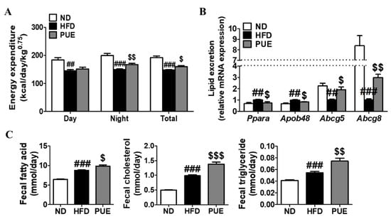 The energy expenditure of the HFD group was markedly lower than that of the ND group during day and night periods. In contrast, PUE supplementation significantly augmented energy expenditure at night compared to the HFD group. The metabolic rate measurements of energy expenditure per day were significantly higher in the PUE group than in the HFD group (Figure 3A). Changes in the mRNA expression of genes related to cholesterol transport and lipid excretion in the small intestine were assessed (Figure 3B). PUE supplementation resulted in significant downregulation of the lipid transporter genes Ppara and Apob48 compared to the HFD group. Moreover, the mRNA levels of Abcg5 and Abcg8 in the small intestine of PUE-exposed mice were significantly higher than those in HFD-fed mice (Figure 3B). Fecal lipid excretion was significantly higher in HFD-fed mice than in ND-fed mice (p < 0.001), and PUE supplementation significantly increased fecal lipid excretion compared with the other diet groups (Figure 3C).