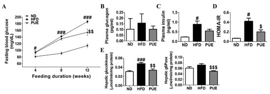 Fasting blood glucose (FBG) levels were markedly higher in the HFD group than in the ND group at weeks 4, 8, and 12. PUE supplementation significantly decreased FBG levels compared to those in the HFD group at week 12 (Figure 4A). The HOMA-IR was significantly lowered by PUE, indicating a decrease in insulin resistance (Figure 4D). Hepatic glucokinase (GK) and G6Pase activities were significantly decreased in the PUE group compared to those in the HFD group (Figure 4E).