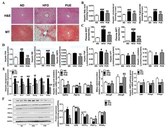 The HFD group had larger and more numerous hepatic lipid droplets compared to the ND group. In contrast, PUE supplementation reduced the number and size of lipid droplets. MT staining of the liver tissue revealed a blue-stained fibrotic area in the HFD group, whereas this was not observed in the ND and PUE groups (Figure 5A). Hepatic FA, CHOL, and TG levels were significantly higher in the HFD group than in the ND group (p < 0.001). In the PUE group, there were remarkable decreases in hepatic FA, CHOL, and TG levels compared to those in the HFD group (p < 0.01) (Figure 5B). In addition, levels of hepatotoxicity markers, such as plasma GOT and GPT levels, were markedly increased in the HFD group compared to the ND group, whereas there was a significant reduction in the PUE group compared to the HFD group (Figure 5C). PUE supplementation markedly attenuated hepatic lipogenic enzyme activities (FAS, ME, G6PD, and PAP) and the expression of lipogenesis-related genes (Fas, Acc1, Scd1, Pparg, Acat, and Cidea) and increased hepatic FAO enzyme activities (CPT and beta-oxidation) and the expression of FAO-related genes (Cpt1a, Pgc1a, and Ppara) compared to the HFD group (Figure 5D,E). The expression of biliary sterol excretion-related genes (Abcg5 and Abcg8) and AMPK signaling pathway genes (Lipe, Prkag1, and Prkag2) in the PUE group was significantly higher than that in the HFD group (Figure 5E). Western blot analysis of the liver showed that FAS protein expression, a hepatic lipogenic factor, was decreased in PUE-treated mice when compared with HFD-fed mice (Figure 5F).