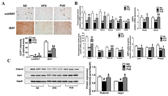 IHC staining of subWAT and iBAT was performed using an anti-UCP1 antibody (Figure 6A). UCP1-IHC of subWAT and IBAT revealed a smaller multilocular lipid droplet accumulation and significantly increased UCP1 expression in PUE mice compared with HFD-fed mice (Figure 6A). Furthermore, the levels of transcription factors (Pgc1a, Sirt1, Ppara, Pparg, Cpt1b, and Cpt2) and browning markers (Ucp1, Prdm16, and C/ebpb) in the subWAT of the PUE group were remarkably higher than those in the HFD group. Moreover, in the subWAT, PUE treatment resulted in a significant upregulation of UCP genes (Ucp2 and Ucp3) and AMPK pathway genes (Lipe, Prkag1, and Prkag2) compared to the HFD group (Figure 6B). In iBAT, the protein expression of PRDM16 and UCP1, both browning markers, was markedly lower in the HFD group than in the ND cohort, whereas that of the PUE-treated group was significantly higher than that in the HFD group (Figure 6C). Therefore, we concluded that PUE treatment promoted BAT activation and WAT browning.