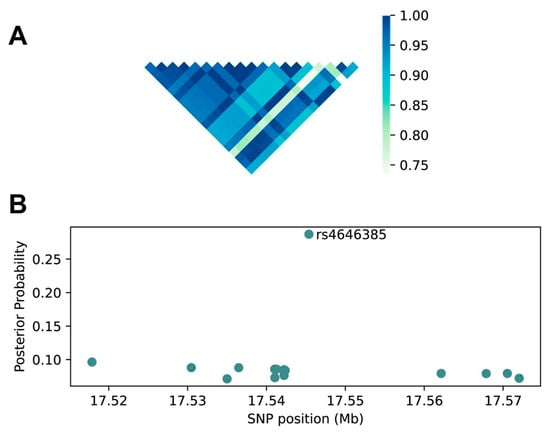 2.3. Fine Mapping Prioritizes rs4646385 for Functional Validation as the Lead SNP