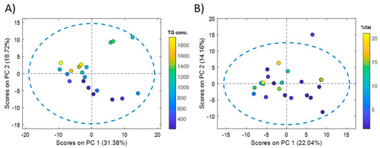 PCA of liver and serum miRNA profiles. PCA scores calculated from the analysis of human liver tissue (A) and serum (B) miRNA profiles. Color scales in the score plots indicate the reference liver TG concentration (µg TG/mg protein) (A) or the % of fat quantified in hematoxylin-eosin stained liver biopsies (B).
