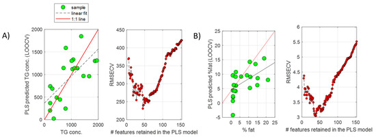 PLS regression of liver and serum miRNA profiles. PLS predicted TG concentrations (µg TG/mg protein) ((A), left) or % fat ((B), left) by LOOCV, and evolution of the RMSECV as a function of the number of retained features included in the PLS models during the recursive feature elimination analysis for model optimization in liver tissue ((A), right) or serum ((B), right) samples.