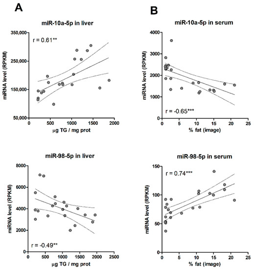 (A) Correlation between liver miRNA levels and tissue TG concentrations. (B) Correlation between serum miRNA levels and % fat in paired liver biopsies. **, p < 0.01; ***, p < 0.001.