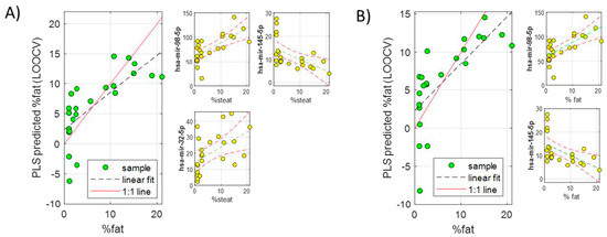 Predicted liver fat % by LOOCV in two PLS models built using two serum miRNA subsets including three (A) or two (B) miRNAs.