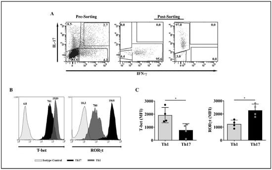 The purity of sorted Th1 and Th17 lymphocytes was evaluated by flow cytometry following cell permeabilization with the BD Cytofix/Cytoperm™ kit (BD Biosciences) for 20 min plus intracellular staining with anti-T-bet-PerCP/Cy5.5 and anti-RORγt-APC mAbs (both from Thermo Fisher Scientific) for 30 min at 4 °C in the dark. Cells were then analyzed by flow cytometry with a FACScalibur flow cytometer (BD Biosciences).