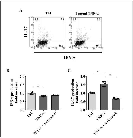 Effect of TNF-α on IFN-γ or IL-17 production by Th1 lymphocytes. Sorted Th1 cells were cultured for 4 days with 1 µg/mL of recombinant human TNF-α alone or in the presence of an anti-TNF-α blocking mAb (infliximab). Cells were then stimulated with PMA and ionomycin plus brefeldin A for 5 h and analyzed for cytokine production by flow cytometry. (A) Representative dot plots of Th1 cells upon stimulus with TNF-α. The numbers in each quadrant represent the percentage of cells. The effect of TNF-α on IFN-γ (B) or IL-17 (C) production was measured on Th1 cells from three healthy donors. Bars represent the mean values ± SD. Data were normalized against cells that did not receive TNF-α or TNF-α plus anti-TNF-α treatment. Kruskal–Wallis test followed by Dunn’s multiple comparison test was carried out to analyze differences between groups. * p < 0.05, ** p < 0.01.