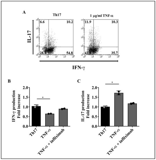 Effect of TNF-α on IFN-γ or IL-17 production by Th17 lymphocytes. Sorted Th17 cells were cultured for 4 days with 1 µg/mL of TNF-α alone or in the presence of an anti-TNF-α blocking mAb (infliximab). Cells were then stimulated with PMA and ionomycin plus brefeldin A for 5 h and analyzed for cytokine production by flow cytometry. (A) Representative dot plots of Th17 cells upon stimulus with TNF-α. The numbers in each quadrant represent the percentage of cells. The effect of TNF-α on IFN-γ (B) or IL-17 (C) production was measured on Th17 cells from two healthy donors. Bars represent the mean values ± SD. Data were normalized against cells that did not receive TNF-α or TNF-α plus anti-TNF-α treatment. Statistical analyses were performed with Kruskal-Wallis followed by Dunn’s multiple comparison tests. * p < 0.05.