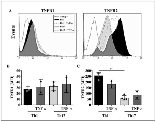 TNF-α does not impact the levels of TNFR1 and TNFR2 on Th1 and Th17 cells. Purified CD4+ T cell subsets were stimulated with 1 µg/mL of TNF-α for 24 h and stained, for flow cytometry, with anti-human TNFR1 or TNFR2 mAbs. (A) Representative histograms showing the expression levels of TNFR1 and TNFR2 on Th1 and Th17 cells at baseline conditions and upon TNF-α stimulus. Solid black line histograms, isotype control; black histograms, Th1 cells; grey histograms, Th17 cells; dashed line histograms, TNF-α-treated Th1 cells; long dashed line histograms, TNF-α-treated Th17 cells. The levels of TNFR1 (B) and TNFR2 (C) were measured on purified CD4+ T cell subpopulations obtained from two to four healthy controls. Bars represent the mean values ± SD. Statistical analyses were carried out with Kruskal–Wallis followed by Dunn’s multiple comparison tests. ** p < 0.01.