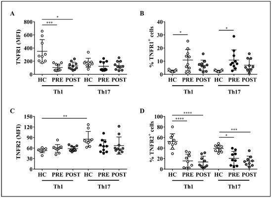 On the other hand, RA patients presented higher percentages of TNFR1+ Th1 and TNFR1+ Th17 cells before, but not after adalimumab treatment, relative to controls (Figure 7B). In contrast, the frequency of TNFR2+ Th1 and TNFR2+ Th17 cells was significantly lower in patients either before or after anti-TNF-α therapy, as compared to healthy controls (Figure 7D). Importantly, as in the case of TNF-α receptors levels in RA patients, the baseline percentages of Th1 and Th17 lymphocytes expressing TNFR1 and TNFR2 did not change upon therapeutic neutralization of TNF-α (Figure 7B,D, respectively).