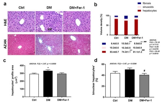Microscopic analysis of liver tissue of control (Ctrl), diabetic (DM), and diabetic Fer-1-treated (DM + Fer-1) animals. (a) Hematoxylin and eosin (H&E) and AZAN trichrome staining; scale bars: H&E—50 µm, AZAN—100 µm, inf—infiltration. (b) Volume density of hepatocytes, sinusoids, and fibrosis. (c) Hepatocytes profile area. (d) Proportion of binuclear hepatocytes. Values presented as means ± SEM. Statistical significance: compared with the Ctrl group (*), * p < 0.05, ** p < 0.01; *** p < 0.001; DM vs. DM + Fer-1 comparison (#), # p < 0.05; ### p < 0.001.