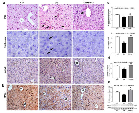 Lipid peroxidation-related and antioxidative parameters in liver tissue in control (Ctrl), diabetic (DM), and diabetic Fer-1-treated (DM + Fer-1) animals. (a) DAB-enhanced Pearls’ iron staining demonstration of ferrous ions accumulation (arrows); Sudan III stain-detected lipofuscin (arrows) and immunohistochemical detection of 4-HNE; scale bars: iron and 4-HNE—50 µm, lipofuscin—20 µm. (b) Immunohistochemical detection of GPX4; scale bars: 50 µm and (c) quantification of tissue and nuclear GPX4 immunopositivity; cv—centrilobular vein, pv—portal vein. (d) Total SOD activity. (e) Protein content of pACC; β-actin serves as a protein-loading control; blots represent three independent experiments. Values presented as means ± SEM. Statistical significance: compared with the Ctrl group (*), * p < 0.05, *** p < 0.001; DM vs. DM + Fer-1 comparison (#), ## p < 0.01; ### p < 0.001.