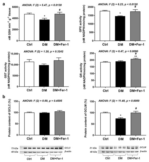 Changes in the GSH content and activities of GSH-related antioxidative enzymes are summarized in Figure 3a. A significant difference among the groups in the content of GSH and activity of GPX was found in the liver (Figure 3a), being decreased in the DM group when compared to the control (p < 0.05). Both GSH content and GPX activity in the DM + Fer-1 group returned to the control level and increased significantly compared to the DM group (Figure 3a). Although there were no significant changes in GST activity between the groups, there was a decreasing trend in the DM group compared to control, which disappeared in the DM + Fer-1 group. GR activity in the liver was also significantly different between the groups, and a post hoc test revealed that Fer-1 treatment of diabetic animals increased activity of GR compared with both the control and diabetic group (p < 0.01 and p < 0.05, respectively).