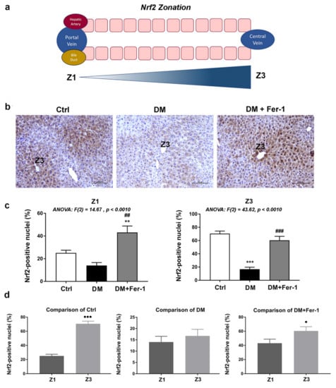 Immunohistochemistry of Nrf2 in liver tissue of control (Ctrl), diabetic (DM), and diabetic Fer-1-treated (DM + Fer-1) animals. (a) Schematic overview of structural zonation of the liver. (b) Immunohistochemical detection of Nrf2 expression across the liver zones; scale bars—50 µm. (c) Proportion of Nrf2 positive nuclei between the groups in Z1 and Z3. (d) Proportion of Nrf2 positive nuclei between the zones in control, DM, and DM + Fer-1 groups. Values presented as means ± SEM. Statistical significance: compared with the Ctrl group (*), ** p < 0.01; *** p < 0.001; DM vs. DM + Fer-1 comparison (#), ## p < 0.01; ### p < 0.001. Z1 vs. Z3 comparison (●), ● p < 0.05, ●●● p < 0.001.