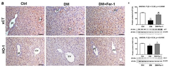 Detection of xCT and HO-1 (a) immunohistochemical localization and (b) protein expression in the liver tissue of control (Ctrl), diabetic (DM), and diabetic Fer-1-treated (DM + Fer-1) animals. Scale bars: 50 μm; cv—centrilobular vein, pv—portal vein. Values presented as means ± SEM. Statistical significance: compared with the Ctrl group (*), ** p < 0.01. DM vs. DM + Fer-1 comparison (#), # p < 0.05, ## p < 0.01.