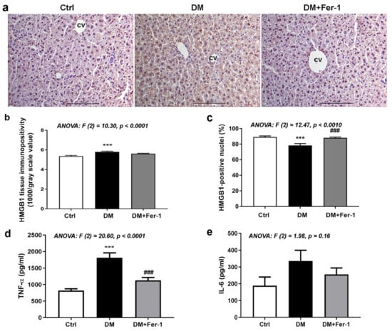 HMGB1, TNF-α, and IL-6 in liver tissue of control (Ctrl), diabetic (DM), and diabetic Fer-1-treated (DM + Fer-1) animals. (a) Immunohistochemical detection of HMGB1; scale bars—50 µm. (b) Quantification of tissue and (c) nuclear immunopositivity of HMGB1. Protein level of TNF-α (d) and IL-6 (e) measured by ELISA. Values presented as means ± SEM. Statistical significance: compared with the Ctrl group (*), *** p < 0.001. DM vs. DM + Fer-1 comparison (#), ### p < 0.001.