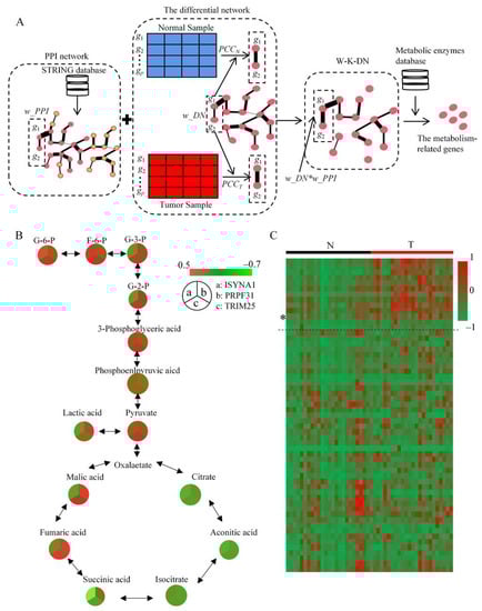 Glucose metabolic reprogramming promotes cancer progression, which is regulated by the expression of associated genes. Given the difficulty in finding genes that regulate the reprogramming of glucose metabolism from a large number of genes, multi-omics integration analysis helps to define key genes that lead to metabolic reprogramming in PCa. To identify the important biomolecules, several computational methods based on network analysis have been proposed [,,]. The differential network (DN) analysis method aims at identifying the disease-related important biomolecules or modules []. DN can be classified into two categories: statistics-based differential network (S-DN) and knowledge-based differential network (K-DN). S-DN is constructed by statistical measures, such as Pearson correlation coefficient (PCC), partial correlation coefficient, and mutual information (MI). For example, PB-DSN used PCC to measure the feature relationship and construct the differential subnetwork for identifying the potential biomarkers of hepatocellular carcinoma []. In contrast, K-DN enables the use of known biological knowledge (protein interactions, reactions, pathways, etc.) to identify relationships between biomolecules, reduce false associations, and guide biological network construction. Combining gene expression data and protein–protein interaction (PPI) networks to define key nodes of biological development (MarkRank) has shown good predictive accuracy and high specificity associated with the disease []. K-DN can also cover experimental data gaps to explore the key factors affecting disease. Therefore, combining the advantages of the two approaches and the metabolic background knowledge will help to define the key metabolism-related genes affecting the progression of PCa.