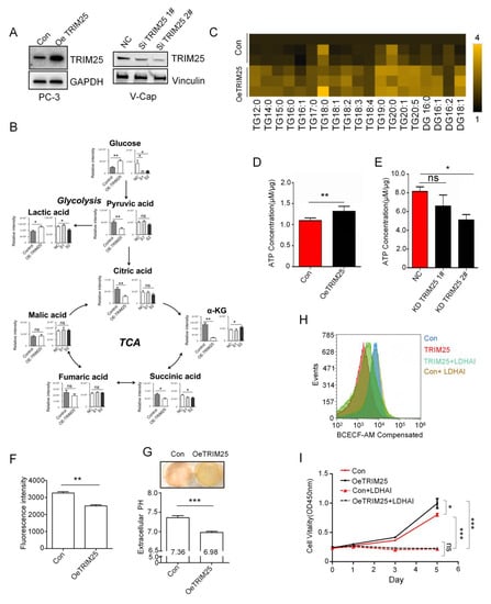 To further analyze the roles of TRIM25 in the regulation of glucose metabolism, TRIM25 overexpression or knockdown cells were constructed (Figure 2A). Higher levels of glucose and lactic acid were observed in the TRIM25 overexpression group than in the control group, while most of the metabolites were reduced in the TCA cycle, such as citric acid, α-KG, and succinic acid (Figure 2B). In contrast, TRIM25 knockdown V-Cap cells had relatively lower levels of glucose and lactic acid. For TCA cycle metabolites, α-KG and succinic acid were significantly increased and decreased in the knockdown group, respectively. Other metabolites were not significantly different (p > 0.05) compared with the control group (Figure 2B). Interestingly, the total pyruvic acid level was significantly reduced in overexpressed TRIM25 cells. Pyruvic acid can be converted to acetyl coenzyme A to enter the lipid metabolism pathway. Therefore, intracellular lipids were examined. Triglyceride (TG) and diglyceride (DG) were significantly elevated with regards to TRIM25 overexpression (Figure 2C). In addition, overexpression of TRIM25 produced more ATP (Figure 2D), while knockdown of TRIM25 reduced intracellular ATP (Figure 2E). The above results suggest that TRIM25 regulates the reprogramming of glucose metabolism, promotes lipid synthesis, and produces more ATP to meet the needs of cell proliferation.