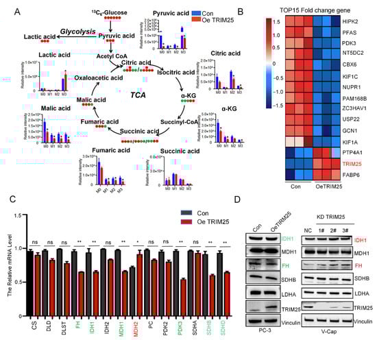 TRIM25 enhances glycolytic flux by downregulating the expression level of TCA cycle-related enzymes. (A) GC–MS detection of metabolic flux changes in glucose-13C6-labeled TRIM25 overexpression PC3 cells. M0, unlabeled mass of isotopologue; Mn, native metabolite mass (M) plus number of isotopically labeled carbons (n). Error bars show the mean ± SEM of three independent replicates or more. ns, not significant; *, p < 0.05; **, p < 0.01, as determined by unpaired t-tests. (B) Heat map plot with the top 15 most significant differential genes in transcriptomics. (C) The mRNA expression of TCA-related genes in TRIM25 overexpression PCa cells. *, p < 0.05; **, p < 0.01, as determined by unpaired t-tests; ns, not significant. (D) The protein expression of TCA-related enzymes in PCa cells.