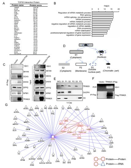 TRIM25 performs RNA processing functions. (A) Top 30 proteins based on protein scoring by LC-MS. (B) GO annotated TRIM25-interacting protein function. (C) Verification of TRIM25-interacting proteins by immunoprecipitation with Flag-M2 beads. (D) Flowchart of cell fractionation. (E) TRIM25 expression in various fractions of V-Cap cells. (F) RNA-Chip validated TRIM25 binding to RNA of IDH1. (G) The subnetwork of TRIM25 constructed by integrating the W-K-DN and the protein–RNA interactions.