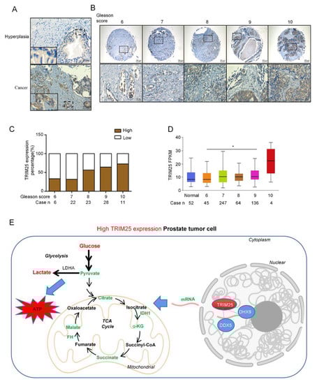 To clarify whether TRIM25 is associated with the malignancy of PCa, TRIM25 protein levels were detected in a PCa tissue microarray through immunohistochemistry (IHC) staining. IHC staining indicated that TRIM25 was highly expressed in PCa cells, and mainly located in cytoplasm and nuclear region (Figure 5A). To explore the role of TRIM25 in the malignance of PCa, we analyzed TRIM25 expression with different Gleason stages, IHC staining suggested that TRIM25 levels were markedly increased in PCa patients with high Gleason scores (Figure 5B). Additionally, 72.7% (8/11) of the Gleason 10 PCa tissues had a higher IHC score, 64.3% (18/28) of the Gleason 9 PCa tissues, 56.5% (13/23) of the Gleason 8 PCa tissues had a higher IHC score, 31.8% (7/22) and 33.3% (2/6) of Gleason 7 and 6 PCa tissues had high TRIM25 IHC score (Figure 5C). Moreover, TRIM25 mRNA expression level in PCa cancer patients was analyzed with the Gleason score, which was obtained from the TCGA dataset (http://ualcan.path.uab.edu, accessed on 1 January 2020), and the expression level of TRIM25 was increased with Gleason score (Figure 5D); TRIM25 expression level was significantly higher in Gleason 9 than that in Gleason 6 (p < 0.05).