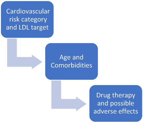 | Very high-risk patients (10-year risk of cardiovascular mortality > 10%) | Atherosclerotic cardiovascular disease (ASCVD) documented clinically or by imaging (acute coronary syndrome, stable angina, coronary revascularization, stroke or transient ischemic attack, peripheral arterial disease). Imaging documented ASCVD, including findings known to be relevant to the development of future clinical events, such as Diabetes mellitus (DM) with end-organ damage (microalbuminuria, retinopathy, and neuropathy) or at least 3 CV (cardiovascular) risk factors or early-onset type 1 diabetes that has been present for more than 20 years. Severe chronic kidney disease (eGFR < 30 mL/min/1.73 m2). | LDL < 55 mg/dL or reduce LDL by at least 50% compared to baseline levels |