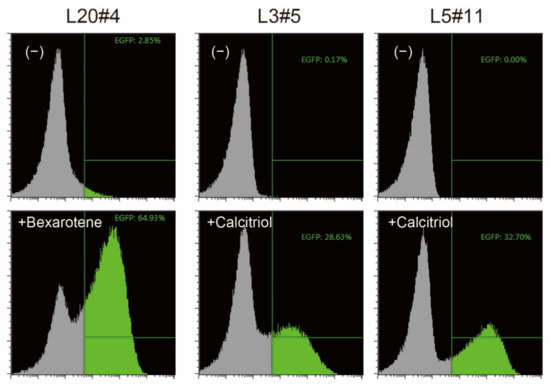 HeLa cells were plated into 6-well or 12-well plates at a concentration of 1.3 × 105/mL. On the following day, the cells were incubated with a mixture of 1 μg of DNA of the hyPBase, and the transposon donor vector (at a ratio of 1:3) and 4 μg of polyethylenimine (Polysciences, Warrington, PA, USA) in 100 μL of Opti-MEM for 1 mL of the culture volume. After cell propagation, the EGFP-positive population, which was considered to be expressed constitutively, was removed by three rounds of cell sorting on an SH800Z cell sorter (Sony, Tokyo, Japan). Next, the cells propagated on a 10-cm dish scale were stimulated with 10 μM bexarotene (No. 11571, Cayman Chemical, Ann Arbor, MI, USA) or 150 nM calcitriol (D1530, Sigma, Tokyo, Japan) overnight at 37 °C in a CO2 incubator; subsequently, those that appeared in the EGFP-high fraction were single-cell sorted into 96-well plates. After propagation of those cells, their reagent responsiveness was checked under a fluorescence microscope. Whenever multiple clones were obtained from the same parental cells, the genomes were subjected to a splinkerette PCR analysis, as described in [1], to select independent clones as assumed from their band patterns.