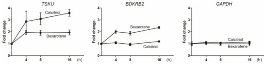 Real-time PCR analysis of the expressions of endogenous TSKU and BDKRB2 upon stimulation by 10 μM bexarotene or 1 μM calcitriol. HPRT1 was used as the internal control. The graphs show the mean of two experiments per gene with three measurements each. Error bars indicate SD.